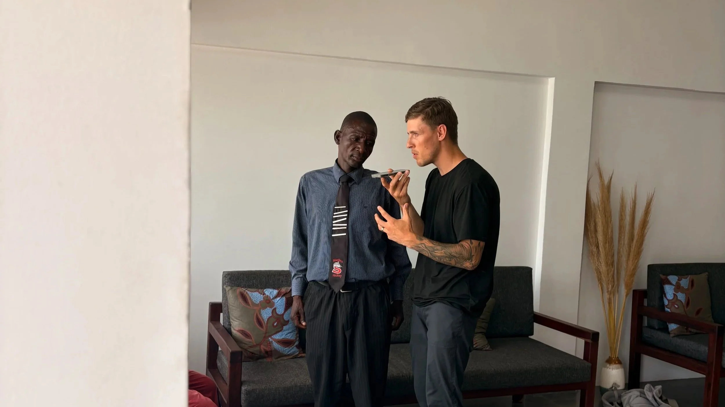 Kelvin talking with Pastor Jaime and using an app to help translate.