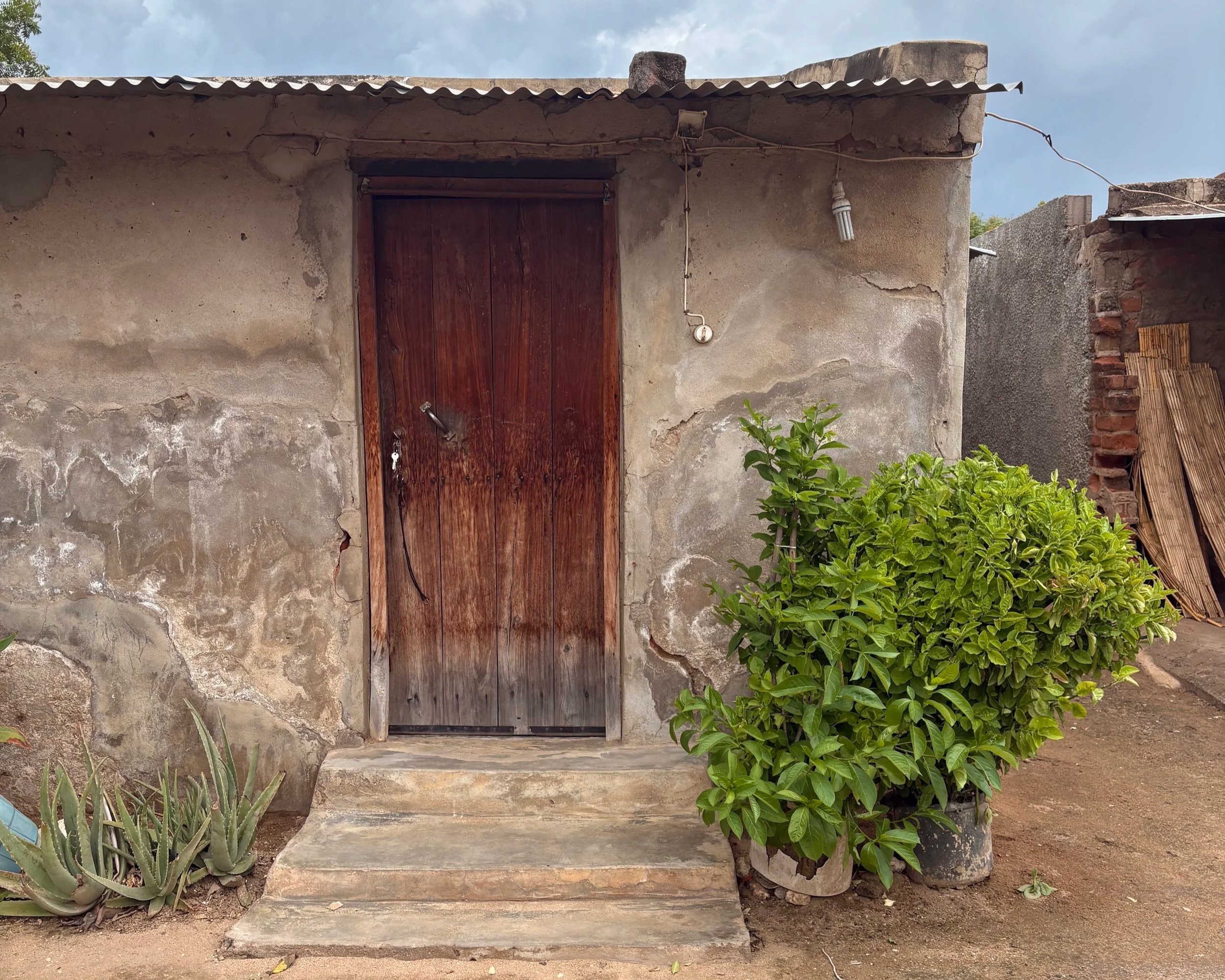 When we arrived in his village, we saw the reality of his prayer request. The church building was a tiny concrete block room — no windows, no ventilation, no bigger than a small bathroom. One row of plastic chairs was pressed tightly against the wall with a sheet draped over them for guests. A small desk in the corner held a microphone and speaker. In another corner sat a bucket of water with two plastic cups for the congregation.